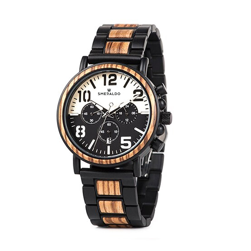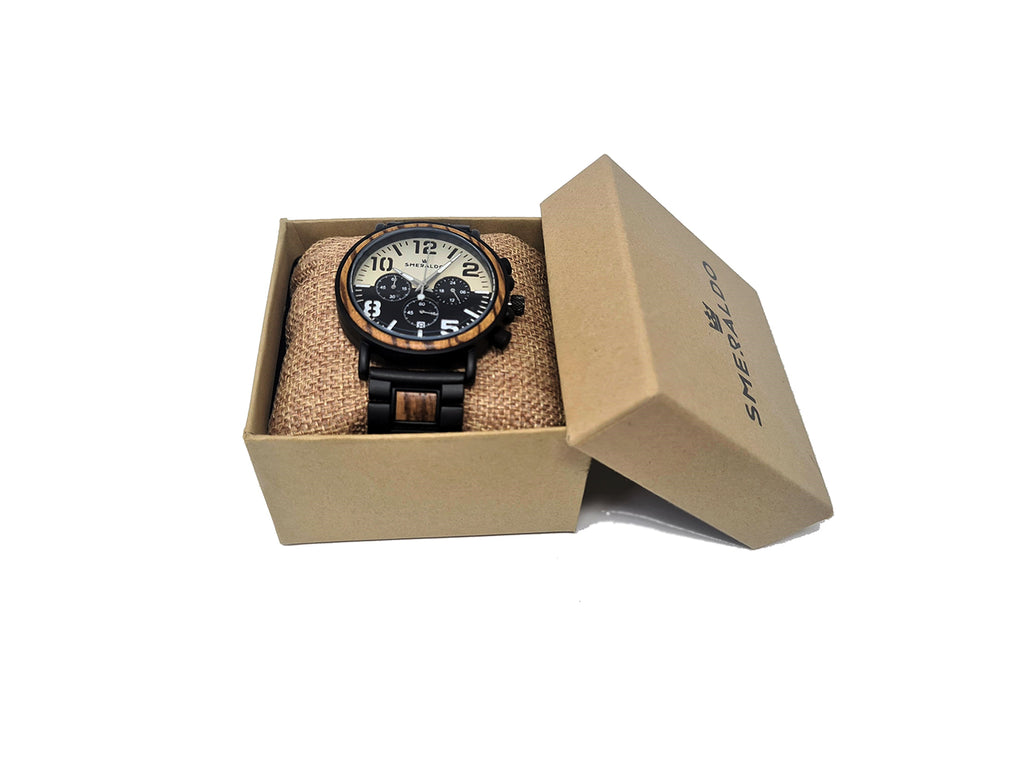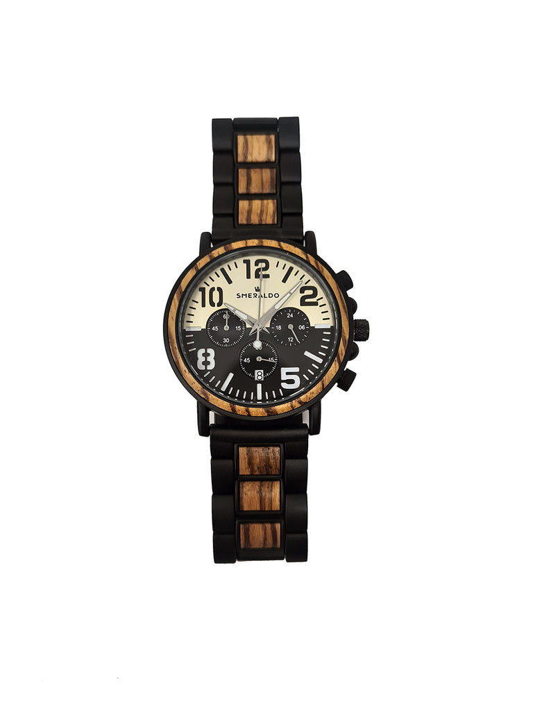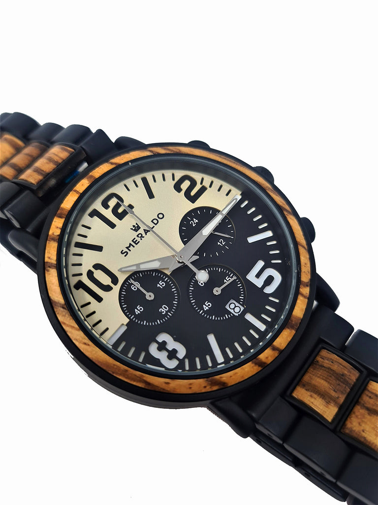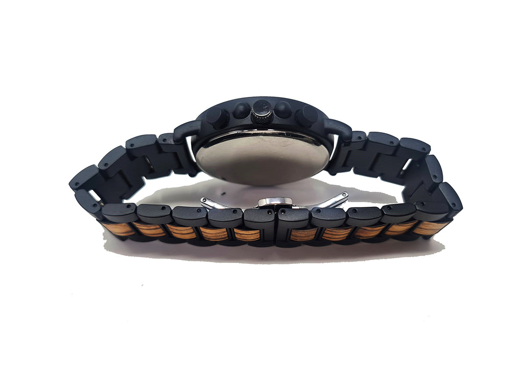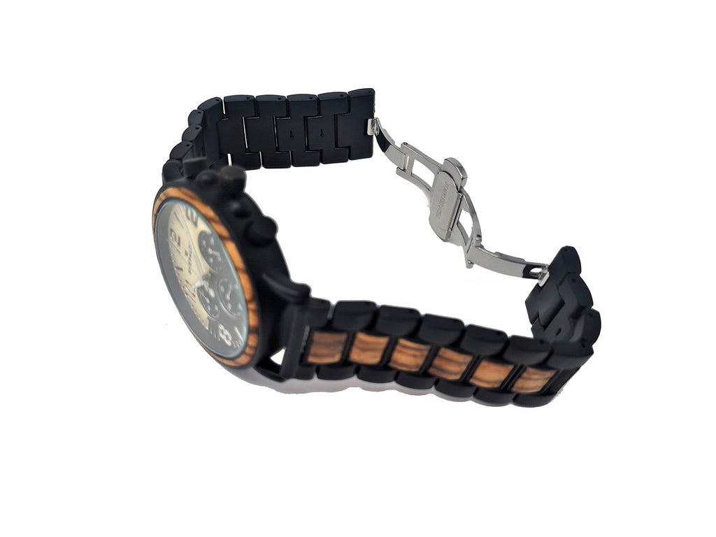 El reloj Sirius esta equipado con un movimiento de cuarzo japonés de alta calidad y cinturon y broche a base de acero inoxidable color negro que se cierra con solo un pulso. La caja es de 44 mm de diámetro, la correa y la caja están fabricadas con madera autentica y natural de zebrano enmarcadas con acero inoxidable.